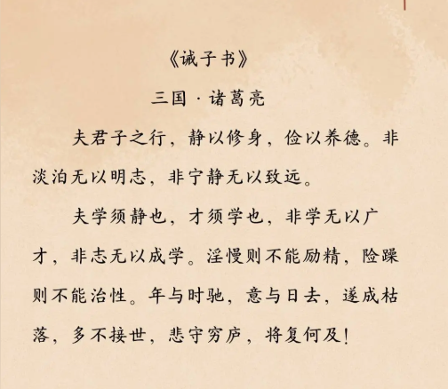 夫君子之行,静以修身,俭以养德。 非淡泊无以明志,非宁静无以致远。 夫学须静也,才须学也,非学无以广才,非志无以成学。 淫慢则不能励精,险躁则不能治性。 年与时驰,意与日去,遂成枯落,多不接世,悲守穷庐,将复何及!